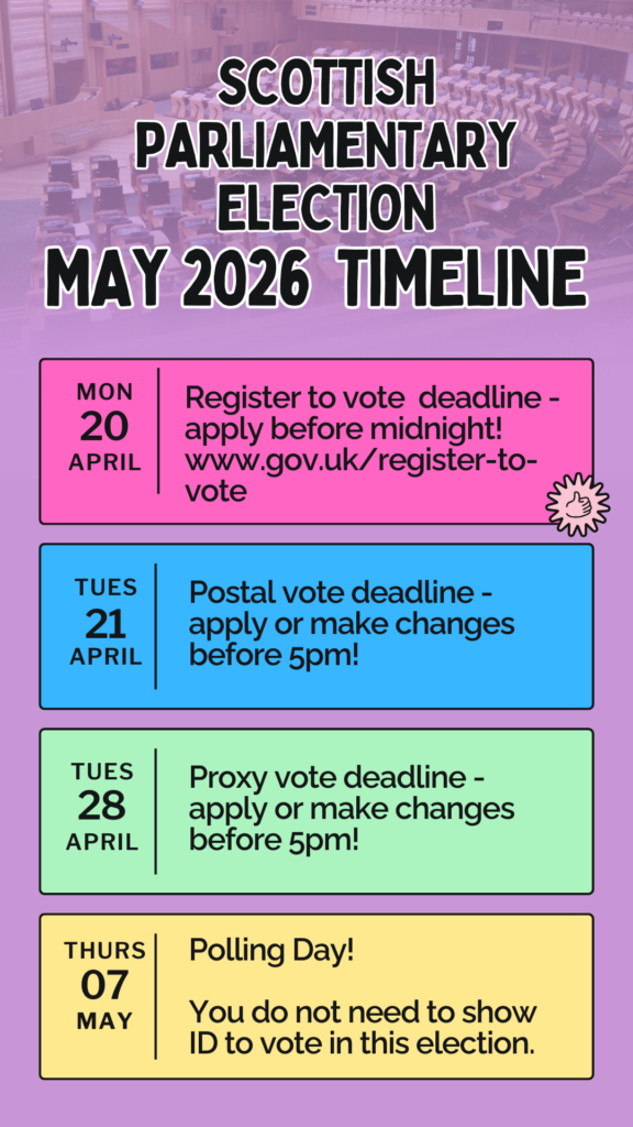 Contents Image of the Scottish Parliament Debating Chamber above a purple background with the words "Scottish Parliamentary Election 7th May 2026". At the bottom is our Logo